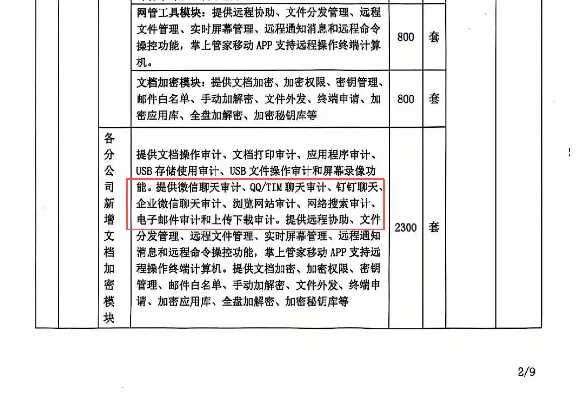 一家位于武汉市的小型科技公司委托固信将产品送至北京市朝阳区建国门外大街甲6号WWT大厦某层交货,该合同的货物清单明确显示,“提供微信聊天审计、QQ/TIM聊天审计、钉钉聊天、企业微信聊天审计、浏览网站审计、网络搜索审计、电子邮件审计和上传下载审计”的模块购买数量为2300套。