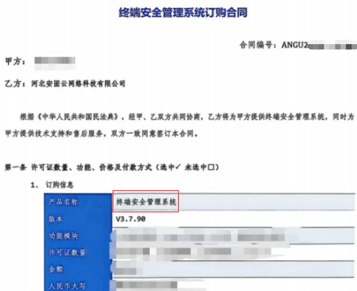 在和销售人员沟通过程中,其直接发来了某院校的采购合同扫描件。订购信息显示,该院校采购的软件为“终端安全管理系统”。